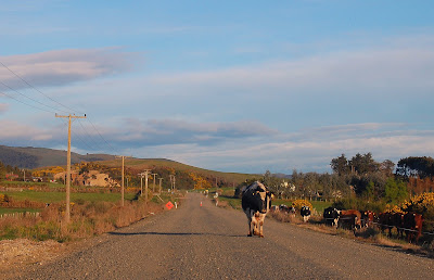記得有一天清晨五點多我殺到Kaka Point拍日出,在回程的大馬路上遇到一隻剛被擠完奶的乳牛朝我迎面走來,早上七點多的陽光還是金黃一片,我把車停在路中央,然後拿出我的相機從車上拍這隻牛。走在牛群外的牛格外顯眼,更讓這個地方的寧靜突顯出來。